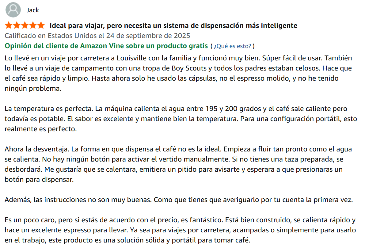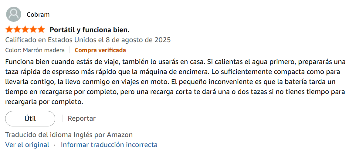 Funciona bien cuando estás de viaje, también lo usarás en casa. Si calientas el agua primero, prepararás una taza rápida de espresso más rápido que la máquina de encimera. Lo suficientemente compacta como para llevarla contigo, la llevo conmigo en viajes en moto. El pequeño inconveniente es que la batería tarda un tiempo en recargarse por completo, pero una recarga corta te dará una o dos tazas si no tienes tiempo para recargarla por completo.