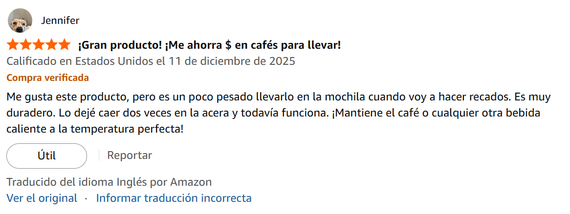 Me gusta este producto, pero es un poco pesado llevarlo en la mochila cuando voy a hacer recados. Es muy duradero. Lo dejé caer dos veces en la acera y todavía funciona. ¡Mantiene el café o cualquier otra bebida caliente a la temperatura perfecta!