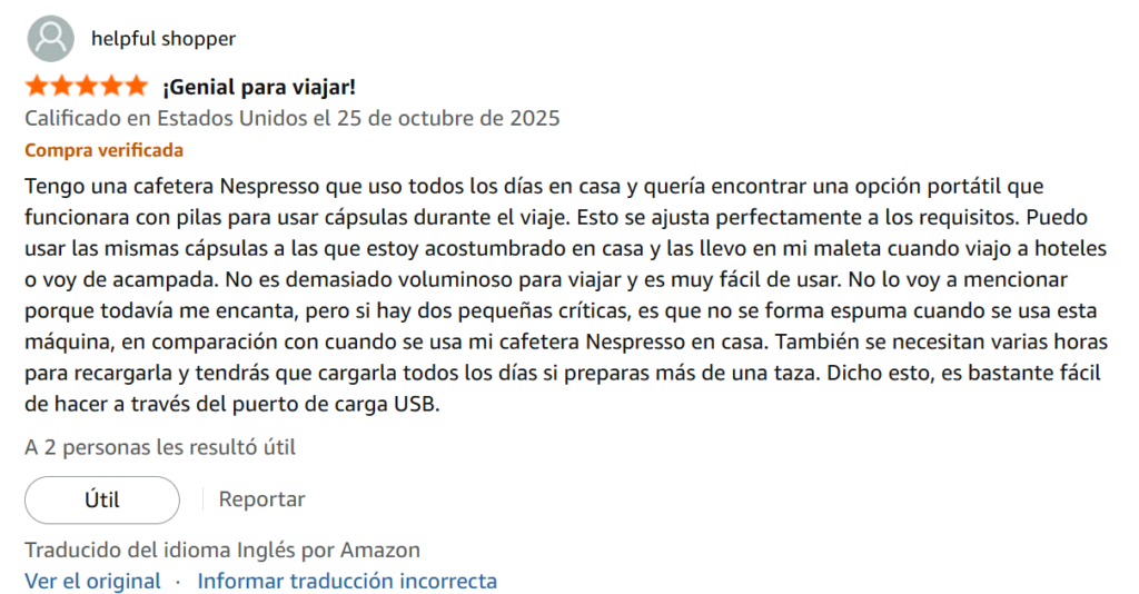 Tengo una cafetera Nespresso que uso todos los días en casa y quería encontrar una opción portátil que funcionara con pilas para usar cápsulas durante el viaje. Esto se ajusta perfectamente a los requisitos. Puedo usar las mismas cápsulas a las que estoy acostumbrado en casa y las llevo en mi maleta cuando viajo a hoteles o voy de acampada. No es demasiado voluminoso para viajar y es muy fácil de usar. No lo voy a mencionar porque todavía me encanta, pero si hay dos pequeñas críticas, es que no se forma espuma cuando se usa esta máquina, en comparación con cuando se usa mi cafetera Nespresso en casa. También se necesitan varias horas para recargarla y tendrás que cargarla todos los días si preparas más de una taza. Dicho esto, es bastante fácil de hacer a través del puerto de carga USB.