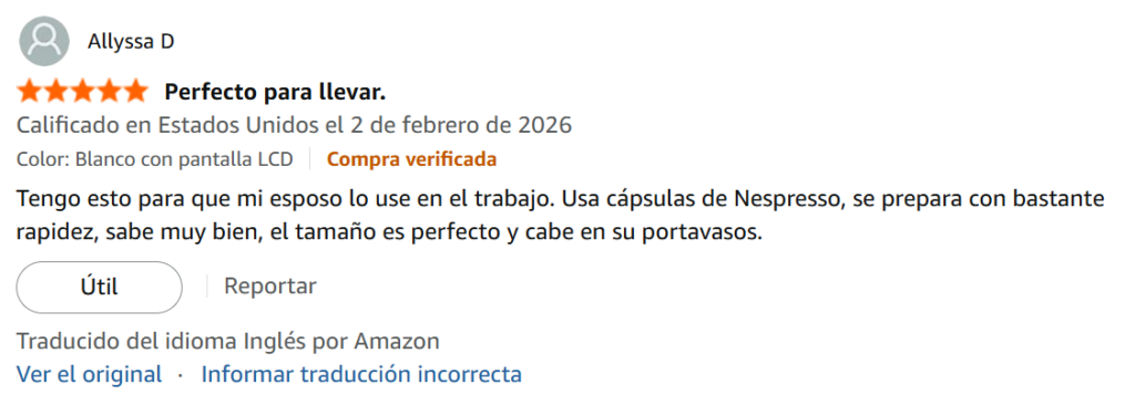 Tengo esto para que mi esposo lo use en el trabajo. Usa cápsulas de Nespresso, se prepara con bastante rapidez, sabe muy bien, el tamaño es perfecto y cabe en su portavasos.