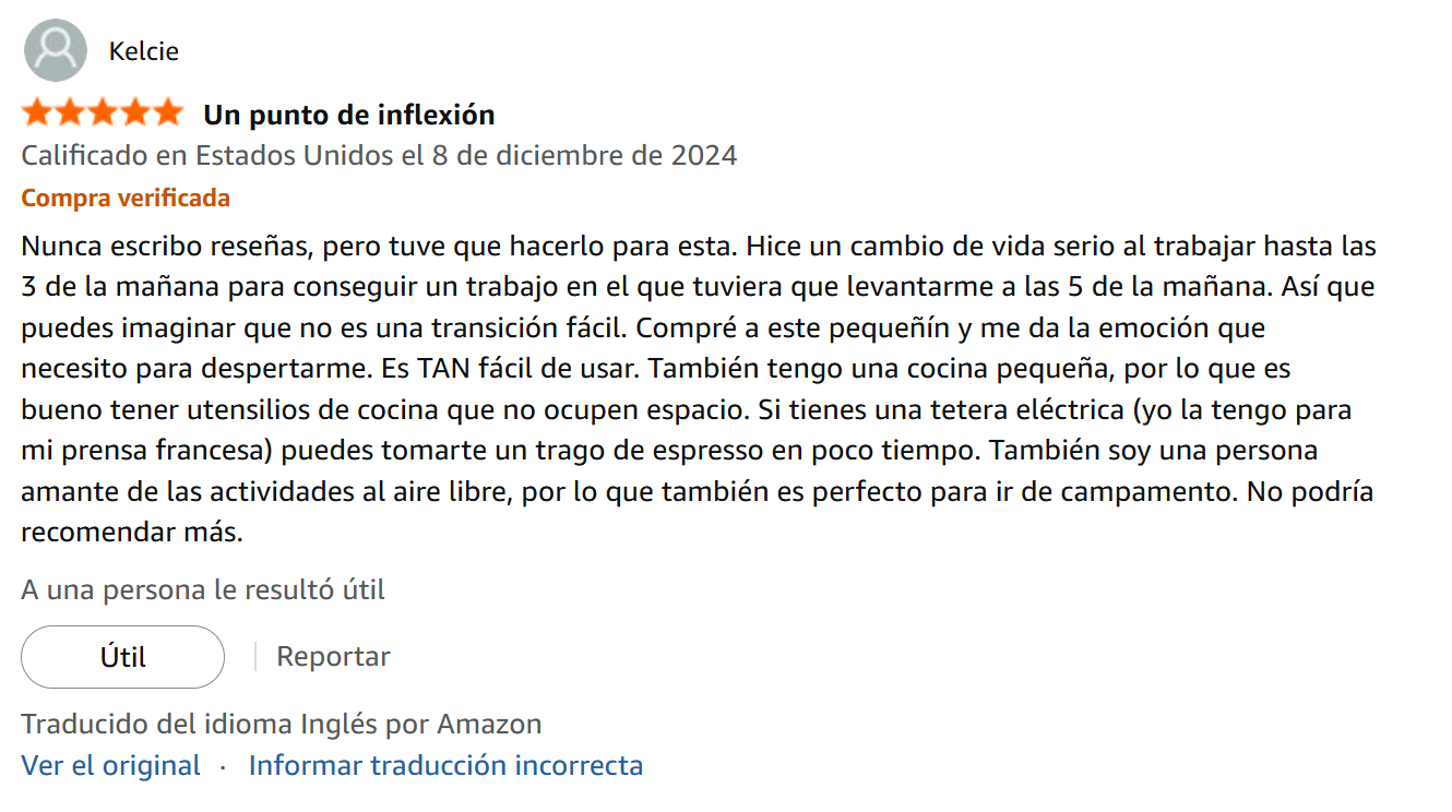 Nunca escribo reseñas, pero tuve que hacerlo para esta. Hice un cambio de vida serio al trabajar hasta las 3 de la mañana para conseguir un trabajo en el que tuviera que levantarme a las 5 de la mañana. Así que puedes imaginar que no es una transición fácil. Compré a este pequeñín y me da la emoción que necesito para despertarme. Es TAN fácil de usar. También tengo una cocina pequeña, por lo que es bueno tener utensilios de cocina que no ocupen espacio. Si tienes una tetera eléctrica (yo la tengo para mi prensa francesa) puedes tomarte un trago de espresso en poco tiempo. También soy una persona amante de las actividades al aire libre, por lo que también es perfecto para ir de campamento. No podría recomendar más.